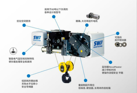 NOVA Silverline是SWF鋼絲繩葫蘆的旗艦產(chǎn)品。此系列產(chǎn)品優(yōu)化使用空間、操作高效、性價比高。NOVA silverline選項多、擴展性強、能適合各種工業(yè)應用??筛鶕?jù)不同客戶的需求,配置其功能。